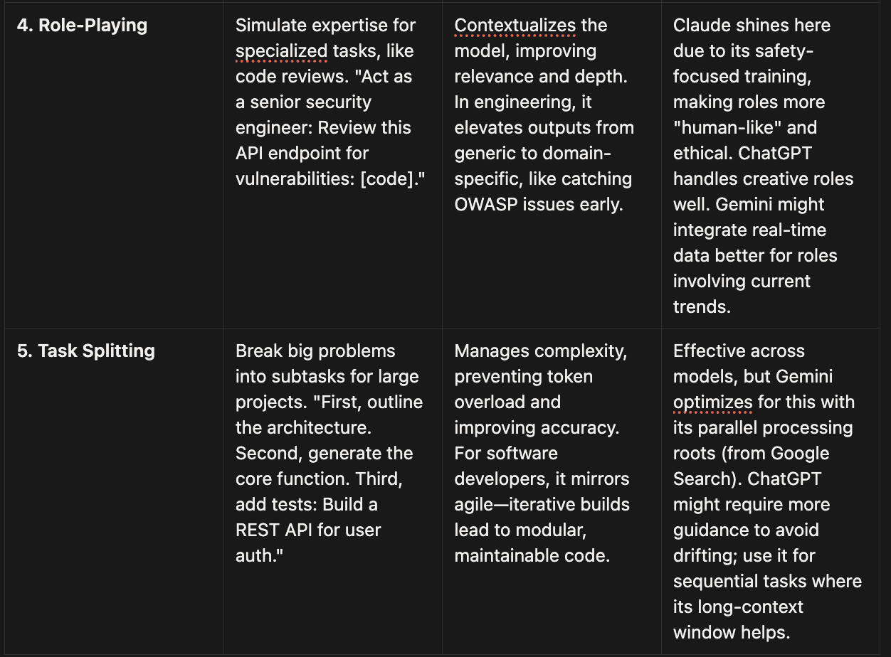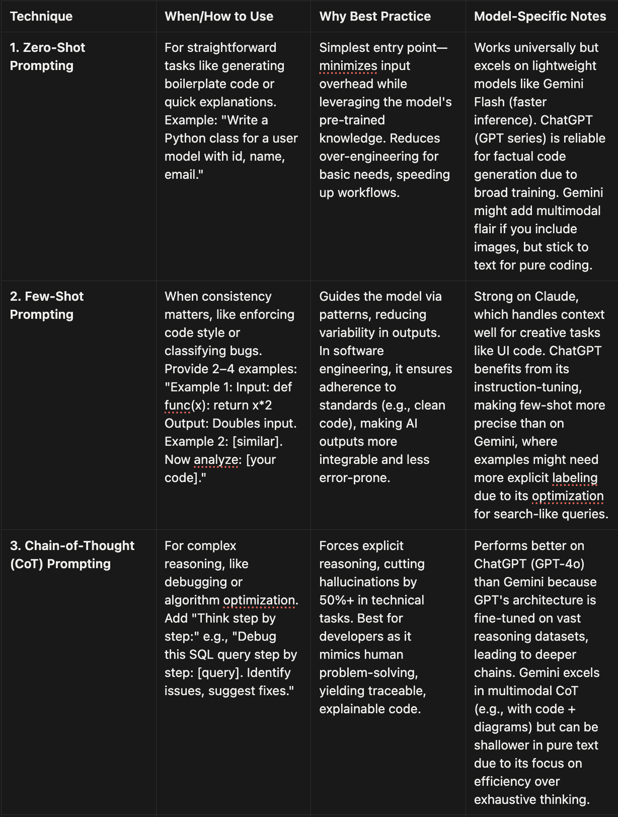 The breakdown of diferent prompt engineering techniques is really practical. The chain of thought approach makes sense for debugging complex issues. I apprecate how you compared each model's strengths, especialy noting Claude preferes structured reasoning while GPT fills in gaps more readily.